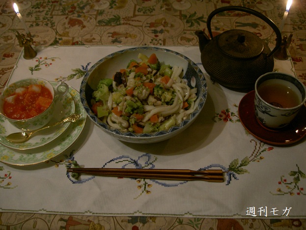 「トマト汁粉」と「うどんのバタ炒め」或る日の朝食風景です。