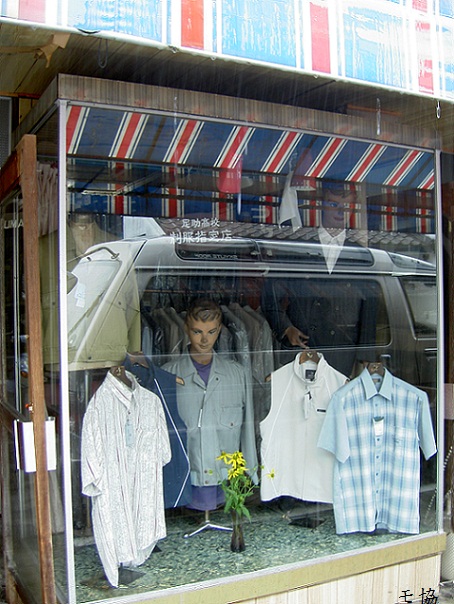 ▲とある洋品店にて、學生服などが賣られてゐたので