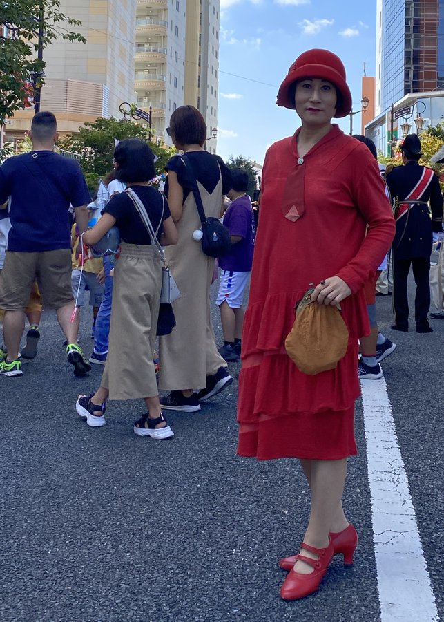 与野駅西口駅前通り周辺(埼玉県)にて開催の「第31回大正時代まつり」に出場いたしました。1920年代當時の赤い洋裝と帽子で、仮裝パレード(2回)とステージでの衣裳紹介に參加いたしました。平成18年(2006年)以降、全て參加して居ります!